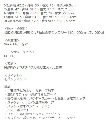 XS/肩幅:45.5・身幅:56・着丈:75・袖丈:69.5cm S/肩幅:47・身幅:59.5・着丈:77.5・袖丈:71cm M/肩幅:50・身幅:61.5・着丈:79・袖丈:72.5cm L/肩幅:51.5・身幅:64.5・着丈:81.5・袖丈:74cm XL/肩幅:54・身幅:67.5・着丈:83・袖丈:75.5cm <防水・透湿性> 10K QUIKSILVER DryFlightRテクノロジー [10,000mm/5,000g] <保温性> WarmFlightRX1 <インサレーション> SHELL <表地> REPREVE?リサイクルポリエステル混紡 <フィット> モダンフィット 機能: ・主要箇所に防水シームテープ加工 ・3箇所でフィット調節可能なフード ・雪の侵入を防ぐパウダースカートと着脱用固定スナップ ・ジャケット、パンツ連結用ループ ・メッシュ付きベンチレーション ・袖にICポケット ・サムホール付きライクラハンドゲイター ・カンガルーポケット、ハンドウォーマーポケット 【在庫、品質管理について】 こちらの商品は楽天販売分として注文可能数量の在庫を確保しております。